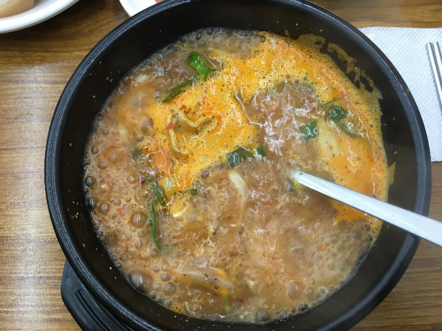 이어서 팔팔 끓는 뚝배기에 순대국이 나왔습니다. 얼큰하게 생긴 국물의 순대국입니다.