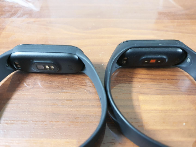 왼쪽이 미밴드6 오른쪽이 미밴드4입니다. 손목에 닿는 센서가 조금 달라진 모양입니다.