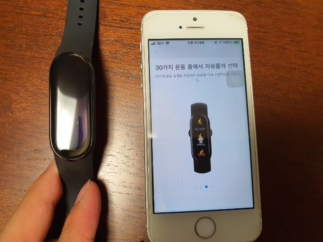 100% 충전이 끝난 뒤 핸드폰과 연결해보았습니다. 미밴드4를 사용하고 있었기에 Mi Fit 어플을 켜보았습니다.