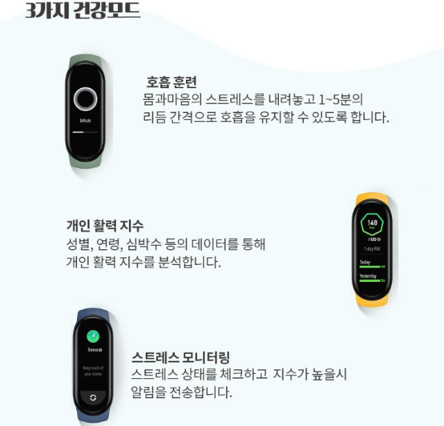 미밴드4에 없던 산소포화도 측정이 생기고 PPG센서(LED 빛을 비춰 혈액의 흐름을 추정하는 센서)가 탑재되어 심박수 측정과 모니터링을 통해 건강을 체크합니다.