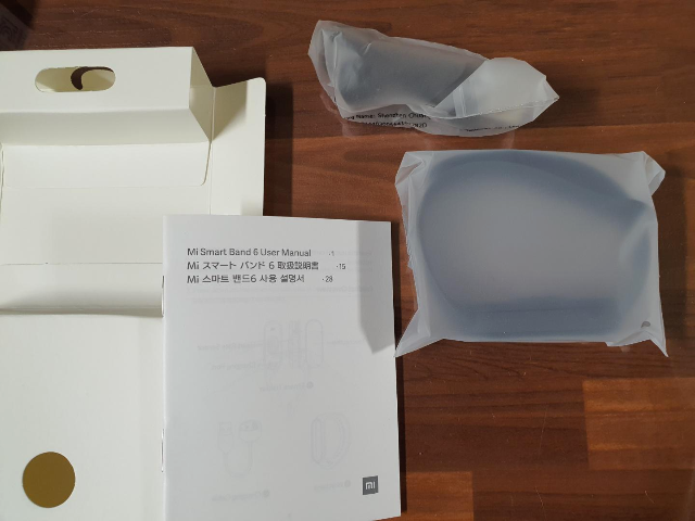 샤오미미밴드6 박스의 구성품입니다. 스트랩이 연결된 미밴드6 본체, 전용 충전 케이블, 사용설명서가 들어있습니다.