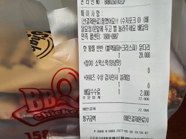 BBQ치킨입니다. 아내 분께서 비비큐치킨에 먹고싶은 메뉴가 생겼다고해서 주문하였습니다.