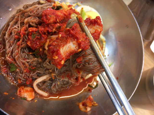 회냉면을 먹어보았습니다. 꼬독꼬독하게 씹히는 회와 얇게 뽑힌 면발이 잘 어울리면서 맛있었습니다. 두꺼운 면의 평양냉면만 자주 먹다가 오랜만에 얇은 면발의 함흥냉면의 먹으니 새로운 느낌이었습니다. 회의 양념이 생각보다 맵지않고 새콤하면서 달달한 맛이 젓가락을 놓치 못하고 계속 먹게 되는 것 같았습니다.