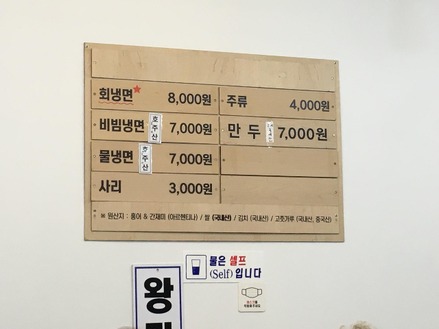 오복함흥냉면집의 메뉴입니다. 메인 음식으로 회냉면으로 표시가 되어있습니다. 골목식당 방송에서는 온면도 굉장히 맛있다고 했었는데 여름이라서 그런건지 메뉴에는 없었습니다. 4명 모두 회냉면으로 주문하고 냉면으로 모자른 양은 만두 하나를 시켜서 채우기로 했습니다.