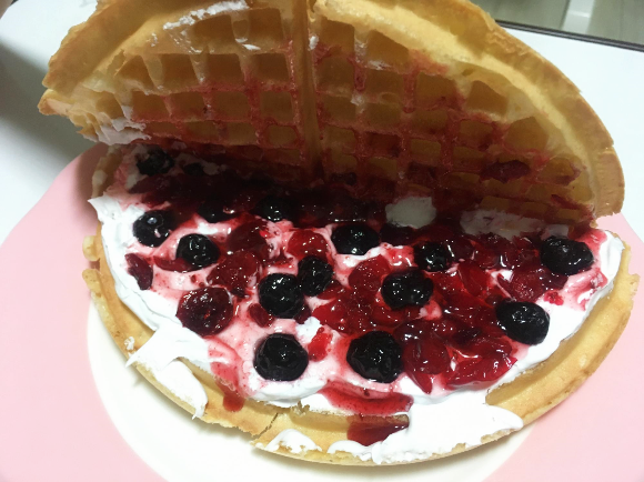 베리베리와플 입니다. 블루베리와 크렌베리가 들어있습니다. 베리를 먹을 때 씹히는 식감과 상큼한 맛이 입을 개운하게 합니다. 크림이 넉넉히 들어있는데 느끼하지 않고 시원하니 깔끔하고 맛있습니다.