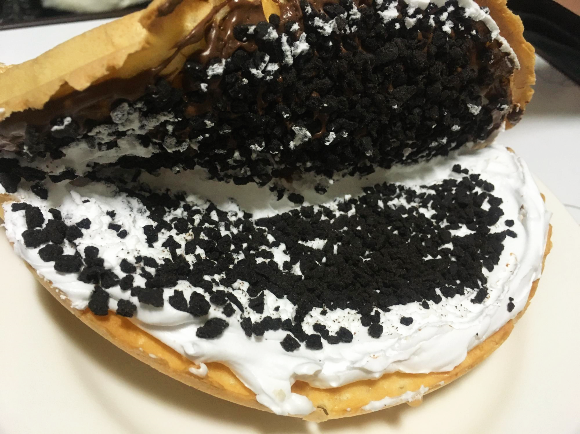 오레오누텔라와플 입니다. 악마의 초콜릿 누텔라를 바르고 크림 위에 오레오 쿠키가 가득 있습니다. 누텔라의 단맛과 크림의 시원함 그리고 쿠키의 바삭 고소함이 괜찮았습니다. 누텔라는 찐득한 단맛이고 오레오 쿠키는 누텔라보다 소프트한 단맛이 있어서 단단맛이 괜찮았습니다.