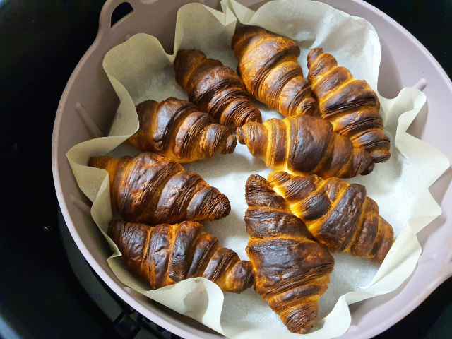 에어프라이어에 1~5개 기준인 13~16분보다 짧게 10분정도로 해서 꺼내보았습니다. 윗부분은 적당히 된 것 같기도 했는데 크로와상 아랫부분이 거의 생지 그대로의 모습이어서 에어프라이어에 몇 분 더 돌릴 수밖에 없었습니다.