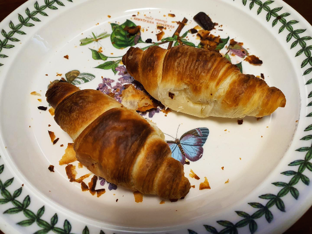 그리고 다시 꺼낸 크로와상입니다. 처음에 구웠던 것처럼 다시 윗부분이 까맣게 되었습니다. 에어프라이어에 넣고 작동하기만 하면 완성될 것 같던 고메 베이커리 크로와상은 제 손에서는 어떻게 잘 되지 않는 것 같습니다. 처음의 기대와는 달리 저에게는 실패 아닌 실패로 남겨진 고메 크로와상입니다. 아쉬운 대로 먹긴 했지만 다음은 언제가 될지 모르겠네요.