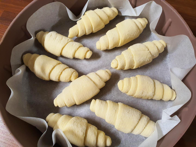 제품을 꺼내어 에어프라이어에 놓아보았습니다. 크로와상 냉동생지 그대로의 모습입니다. 생각보다 크기가 작아서 에어프라이어 안에서 얼마나 부풀지 조금 걱정되었습니다.
