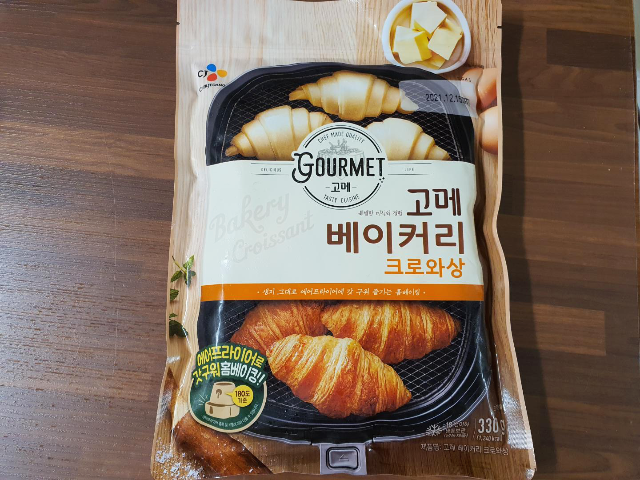CJ고메베이커리 크로와상입니다. 아내 분이 빵을 굉장히 좋아하는데요. 같이 빵을 사러가면 점점 비싸지는 빵 가격에 놀라지 않을 수 없었습니다. 빵을 좀 더 맛있게 먹을 방법으로 홈베이킹을 생각했지만 쉽지 않다고 생각했었는데요. CJ 고메 베이커리 크로와상 제품을 보고 신기하면서 어떨지 궁금해져서 구입하게 되었습니다.