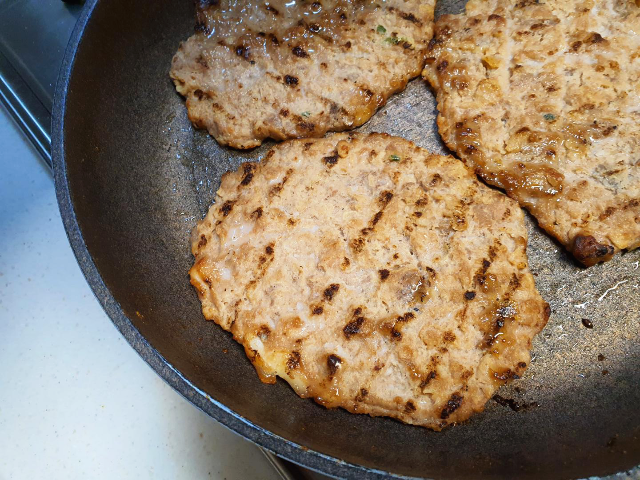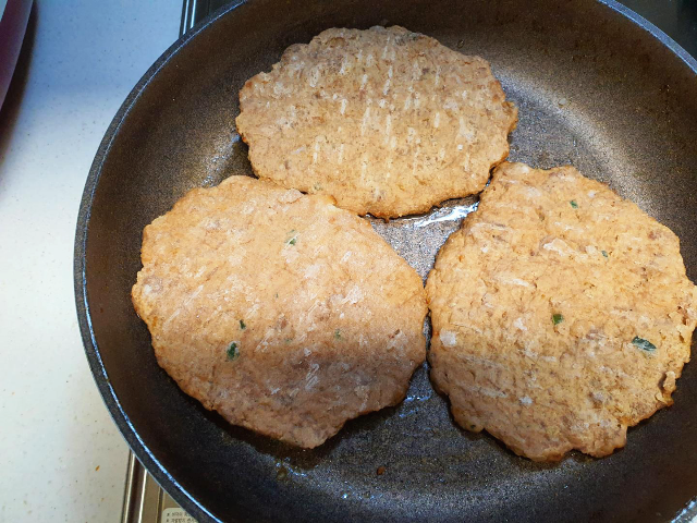 아내 분과 둘이 먹기위해 3개 구워보기로 했습니다. 갈지 않고 굵게 썰어 불에 직접 구워내어 냉동시킨 제품이라고하니 가정에서는 프라이팬에 2차 조리만 간단하게 해도 되는 것 같습니다.