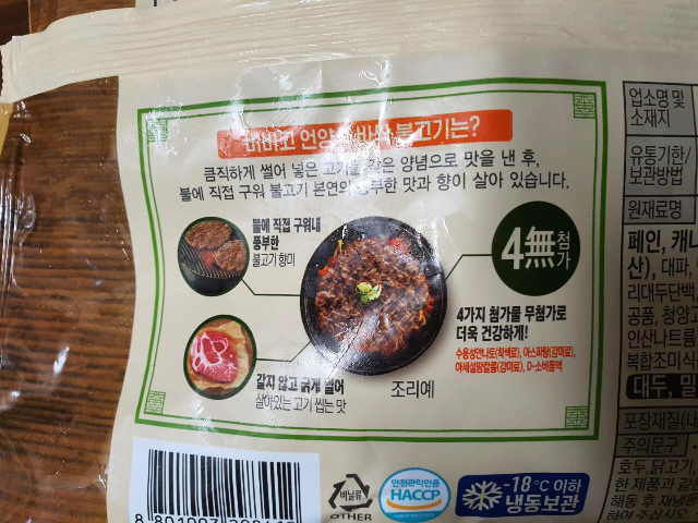 안 좋은 4가지를 무첨가하고 원재료는 어떤 것이 있는지 살펴보았습니다. 고기는 돼지고기를 사용하고 있습니다. 언양불고기는 소고기로 알고 있었는데 언양식(?)으로 돼지고기를 사용하여 단가를 낮춘 것 같습니다. 외국산으로 미국, 스페인, 캐나다 등 다양한 나라의 돼지고기가 섞여있는 잡종인가 봅니다. 그 외에도 어려운 용어의 혼합제제 폴리인산나트륨, 피로인산나트륨, 폴리소르베이트80 등 화학성분 첨가물은 들어가 있습니다.
