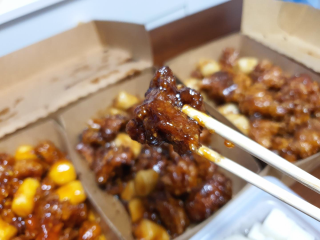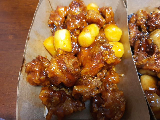 데리야끼풍의 소스로 마늘간장강정보다 오히려 더 진한색의 양념입니다. 달콤강정도 먹어보았습니다.
