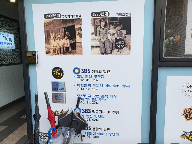 김밥집 입구에는 교리김밥의 역사와 명성을 한눈에 볼 수 있게 해 놓았습니다. 이야기는 많이 들었는데 맛은 어떨지 궁금했습니다.