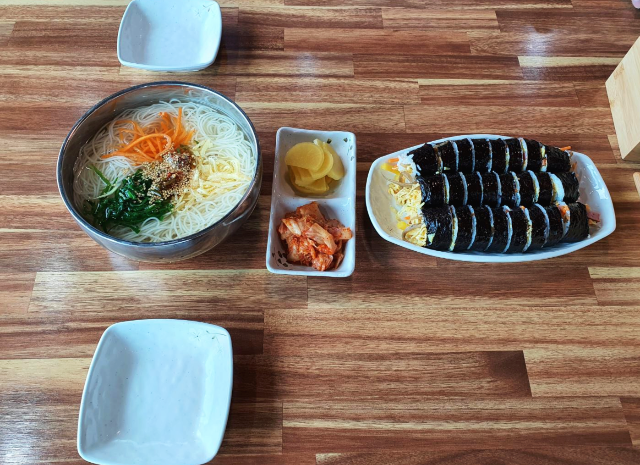포장 주문이 많으면서도 음식이 굉장히 빨리 나왔습니다. 교리김밥의 김밥과 잔치국수입니다.