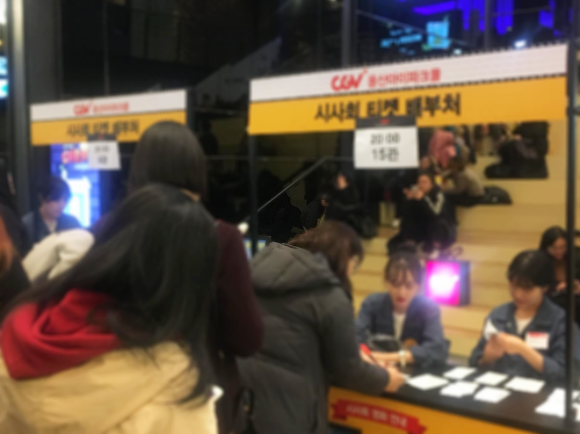 다행히 긴 줄은 빠르게 줄어들었고 20분 만에 표를 받을 수 있었습니다. 예전 시사회는 자리가 랜덤으로 정해져서 별로 좋지 않았는데 이번 시사회 자리는 선착순으로 앉고 싶은 자리를 지정할 수 있어서 좋았습니다.