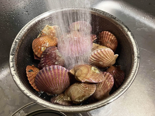 홍가리비를 꺼내서 물로 한번 헹궈주었습니다. 홍가리비를 꺼낼때 나는 바다냄새가 나서 마치 방금 잡아올린 것 같았습니다.
