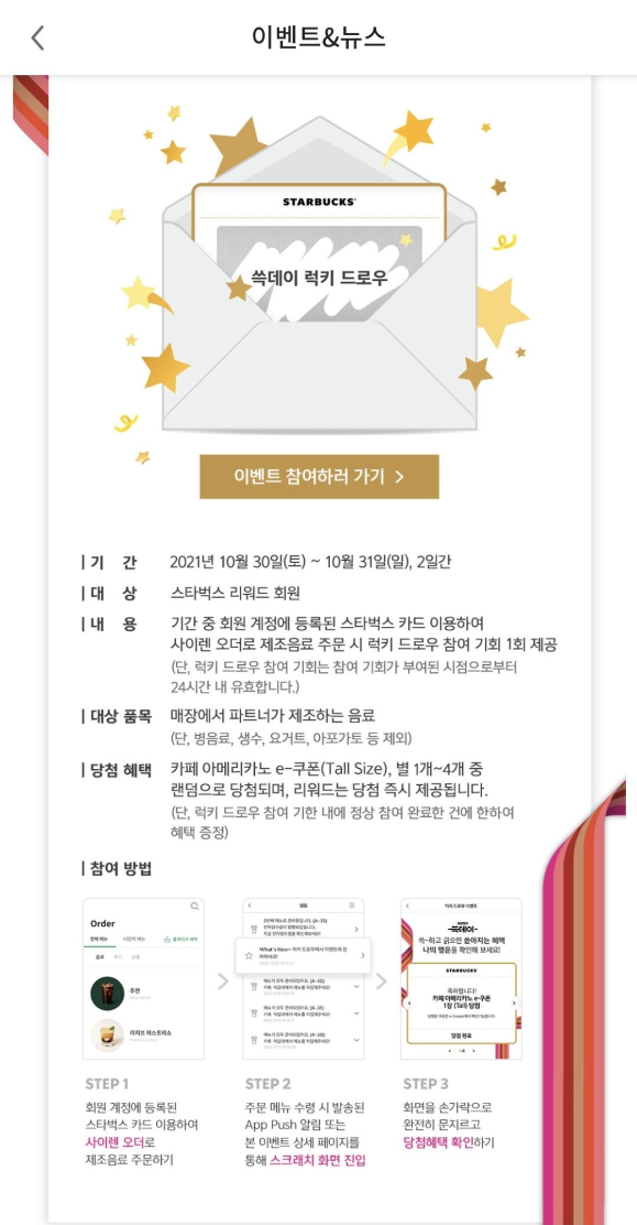 아내 분이 스타벅스 어플로 주문을 하고 있었는데요. 쓱데이 럭키 드로우 기간으로 10월30일과 10월31일 2일간 하고 있는 이벤트 날이어서 사이렌 오더로 음료를 주문하고 럭키 드로우 참여 기회 1회를 받았습니다.