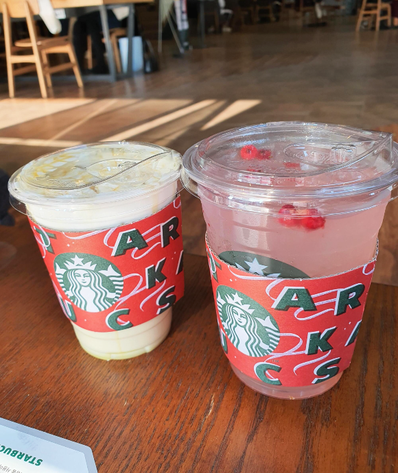 아이스 핑크 캐모마일 릴렉서입니다. 크리스마스에 가장 어울리는 색인 것 같습니다. 새콤달콤하면서도 시원한 맛이 예전 아이스크림의 소다맛과 비슷하게 느껴졌습니다. 색감은 크리스마스인데 맛은 여름입니다. 나름 입맛에 맞아서 괜찮았습니다.
