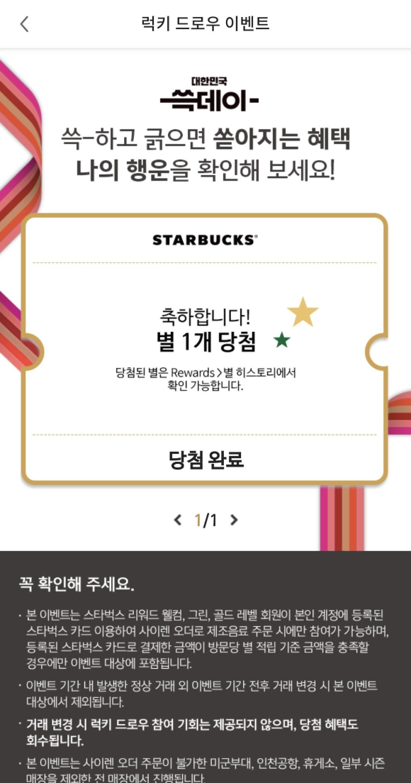 대한민국 쓱데이 럭키 드로우를 스스슥 긁으니 별 1개 당첨. 당첨 혜택으로 카페 아메리카노 e-쿠폰과 별 1개~4개 랜덤으로 제공되는데요. 아내 분은 별 1개가 당첨되었습니다. 별이 1개든 2개든 저는 얼른 음료를 마시고 싶었습니다.