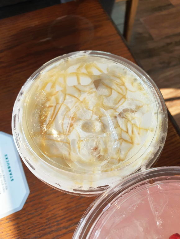 아이스 골든 위시 라떼입니다. 살짝 맛을 보았습니다. 부드러운 크림과 달달한 카라멜 그리고 고구마가 담백하게 느껴졌습니다. 고구마향이 가득해서 정말 겨울이 다가온 듯 느껴졌습니다.