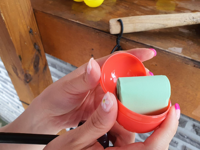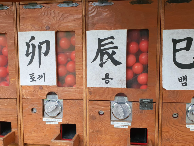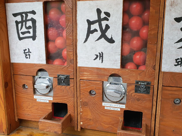 각자의 띠에 맞게 캡슐 뽑기를 고르고 도깨비명당 전용코인을 하나 넣어 돌려주니 빨간공이 하나씩 나왔습니다. 오랜만에 뽑기를 돌려보니 예전 문방구 앞에서 백원짜리 동전으로 뽑기하던 추억이 떠올랐는데요. 백원으로도 즐거웠던 시절이 생각나고 좋았습니다.