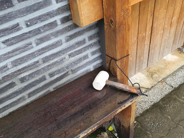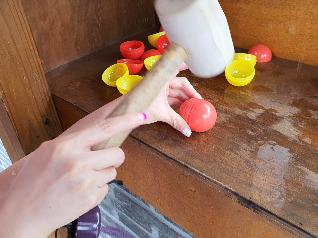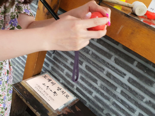 도깨비명당 구석에 매달려있는 망치가 있는데요. 망치로 캡슐을 톡톡 두드리면 캡슐이 열리게 되어 있습니다.
