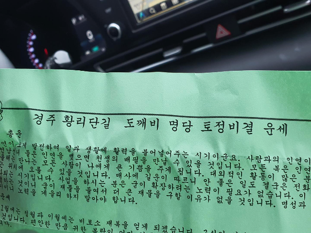 사실 이곳의 캡슐은 손으로 잡아도 열리기 쉬운 캡슐입니다. 아내 분은 그냥 손으로 쉽게 열어버렸습니다. 돌돌 말린 종이 한장이 나왔습니다. 생각보다 긴 글이었습니다. 비가 오는 관계로 차에 가져가서 보기로 하였습니다.