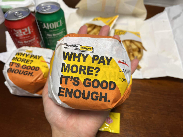 노브랜드 시그니처버거의 크기입니다. 손바닥에 들어오는 크기입니다. 버거가 굉장히 클줄알았는데 생각보다는 귀여웠습니다. WHY PAY MORE? IT'S GOOD ENOUGH.