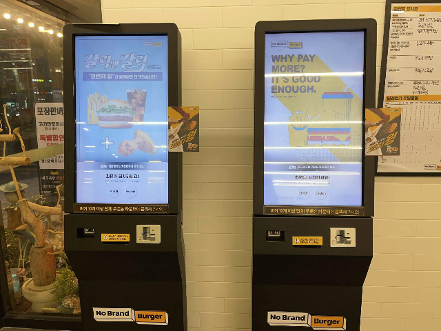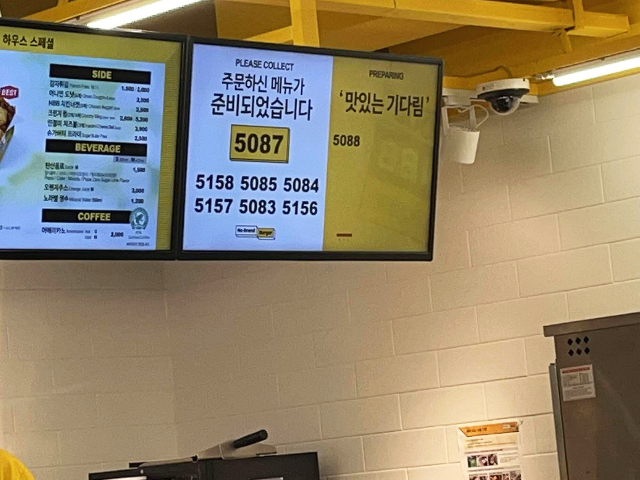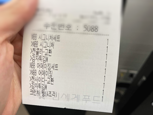 입구 왼쪽으로 키오스크가 있습니다. 처음 오는 곳이기에 버거는 쉽게 결정할 수 있었습니다. 저는 노브랜드의 메인 베스트 버거인 시그니처버거로 정하고 아내 분은 어메이징버거로 주문하였습니다. 그리고 당연히 사이드메뉴를 안고를수 없었는데요. 크런치 윙이 새로 나왔다고해서 크런치윙(4조각)으로 추가하였습니다.