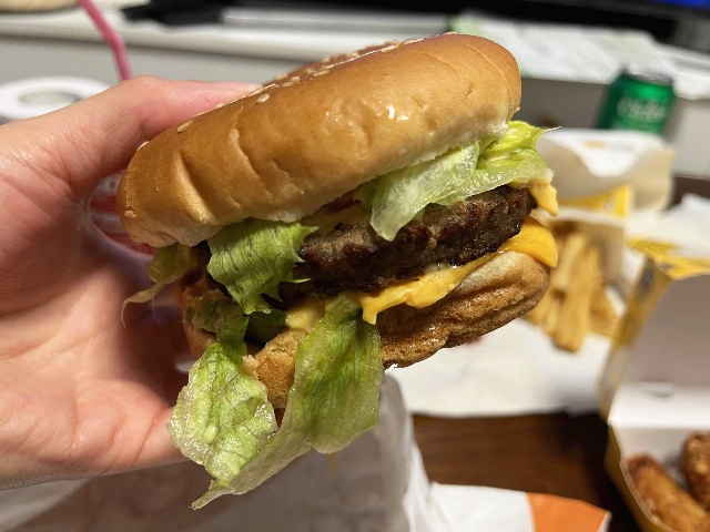 패티가 두개로 입에 착 감기는 고기의 식감이 좋았습니다. 양상추와 토마토가 잘 안느껴질정도로 조금 헤비한 버거입니다. 맥도날드의 빅맥과 비슷한 맛으로 괜찮았습니다.