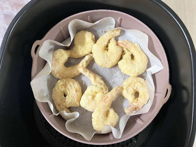 첫 번째 조리방법인 에어프라이어로 조리해보았습니다. 180~190도에서 10~12분간 조리합니다. 실리콘 용기에 담겨 있어서 에어프라이어 특성상 열이 위에서 아래로 순환하기 때문에 절반시간 5분동안 작동한 후 냉동새우를 한번 뒤집어서 다시 5분 작동해주었습니다.