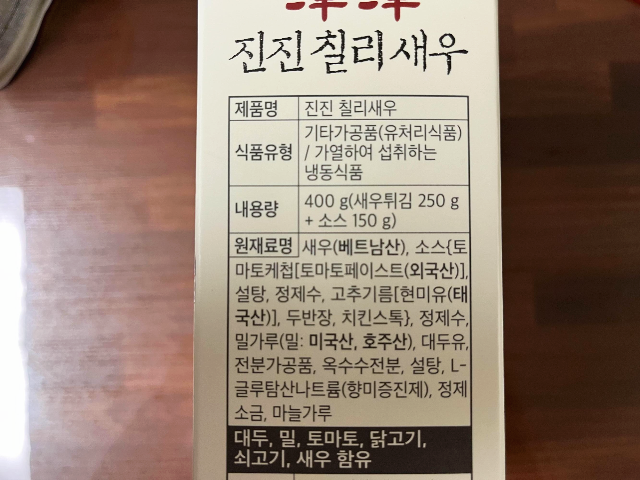 원재료도 살펴보았습니다. 새우는 베트남산이고 소스에는 토마토케첩과 고추기름 그리고 두반장이 들어있습니다. 두반장 때문에 중화풍 소스의 맛이 많이 날 것 같습니다.