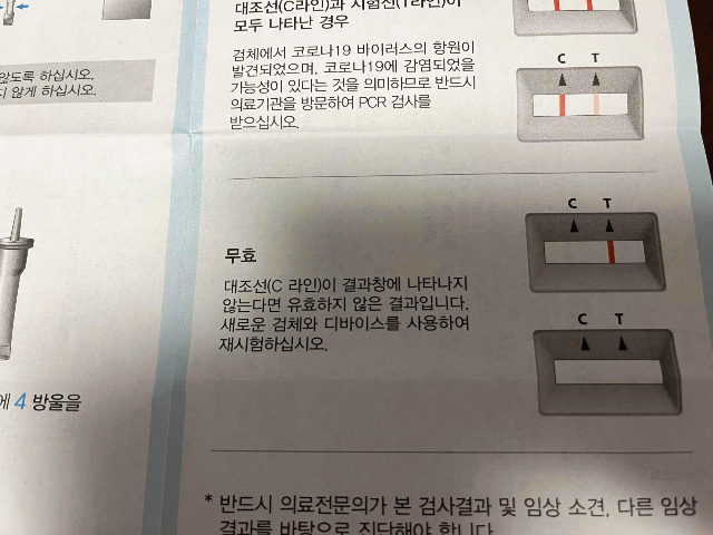 라인에 모두 붉은줄이 나타났을때는 코로나19에 감염되었을 가능성이 있고 시험선(T라인)이나 아무것도 없을때는 무효이니 다시 한번 확인해보시는게 좋을 것 같습니다.