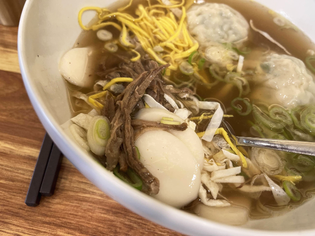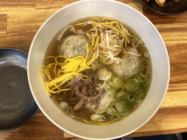 주문한 떡만두국이 나왔습니다. 소고기무국 같은 깔끔한 국물에 소고기 사태, 계란 지단이 고명으로 올려져 있었습니다. 고명이 풍성하게 올려져 있어서 떡만두국이 더욱 맛있게 보였습니다.