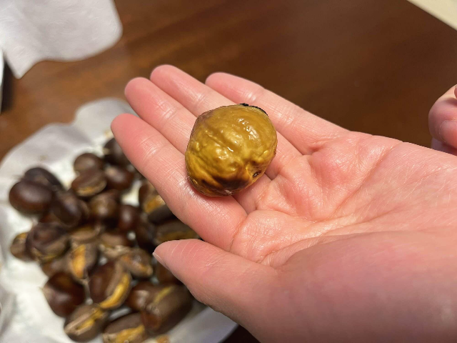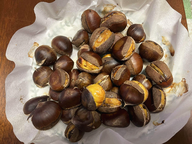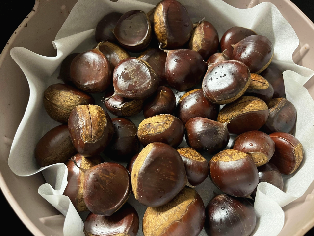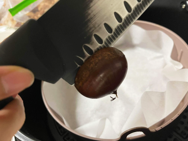 20분 뒤에 에어프라이어에서 꺼내보았습니다. 칼집을 내었던 곳이 딱 벌어지고 맛있는 밤이 빼꼼 나와있었습니다.