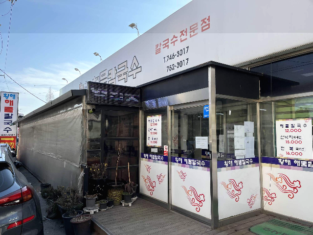 바람도 불고 많이 추웠지만 깨끗한 하늘에 한적한 해돋이를 볼 수 있어서 좋았습니다. 추운 몸을 녹이려 이른 점심을 먹으러 왔습니다. 아내 분이 폭풍 검색하여 찾은 곳은 영종도 맛집이라는 황해해물칼국수입니다. 11시 조금 넘은 시간이었지만 이미 주차장은 만차가 되어서 주변을 서성이다가 근처 수협 주차장에 주차하였습니다. 걸어서 1분도 안걸리고 공휴일이라서 넉넉히 주차할 수 있었습니다.