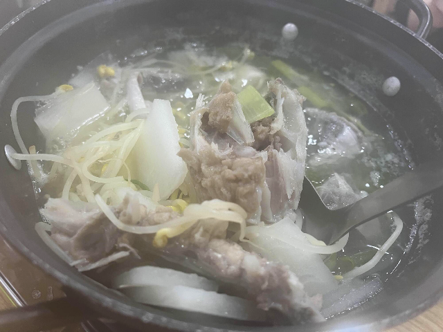 미나리부터 한소끔 끓여내고 먹어보았습니다.