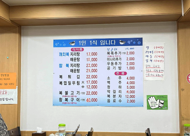 참복지리탕은 국물도 괜찮고 고기도 쫄깃하게 잘 먹었습니다. 복튀김이 조금 아쉬웠지만 복껍질무침도 맛있게 잘 먹고 괜찮았습니다. 복집인데 메뉴에 복사시미가 없는 게 조금 의아했습니다. 메뉴에 있었어도 비싸서 먹지 않았겠지만... 아무튼 맛있게 잘 먹었습니다.