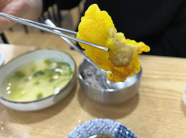 바로 튀겨나온 노오란 빛깔의 복튀김이 먹음직스러워 보였습니다. 복튀김도 한입 먹어보았습니다. 갓 튀겨 나와서 뜨거웠지만 고소함은 더 느껴지는 것 같았습니다. 그런데 복튀김에서 비린맛이 조금 느껴지고 복어살은 조금 퍽퍽한 느낌이 들어서 생각보다는 그저 그랬습니다.