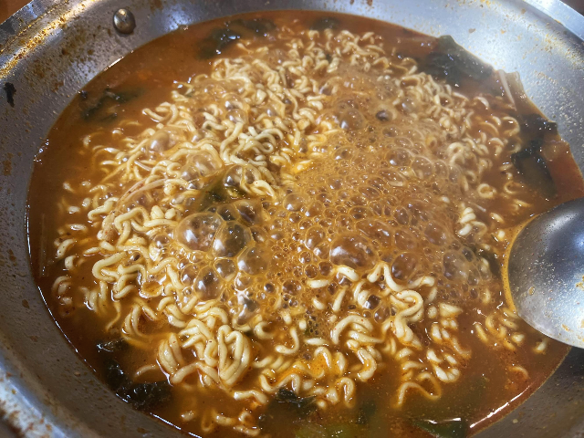 적당히 꼬들꼬들하게 익혀서 먹었습니다. 면발이 정말 탱글탱글하고 맛있었습니다. 일반 라면의 면발과 다르게 더 쫄깃한 맛이 느껴졌습니다. 라면사리가 나올 때 봉지없이 까있는 상태의 면만 나와서 사리면인지 라면의 면인지 확인을 못해서 아쉬웠습니다.