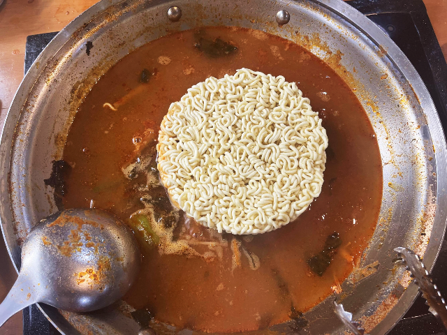 맛있는 뼈 살코기를 잘 발라먹고 남은 육수에 라면사리를 추가하였습니다.
