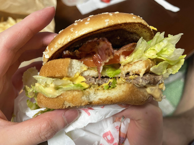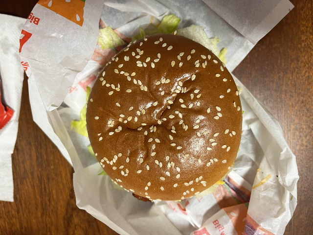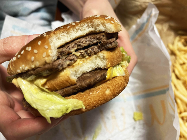베이컨이 살짝 튀어나와 있지만 일반 빅맥과 거의 동일한 모습입니다. 널브러진 양상추는 빅맥의 시그니처 같습니다.