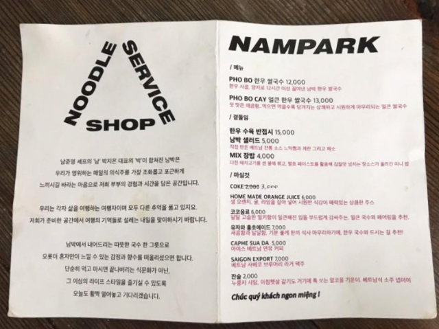 직장 동료들과 점심식사를 하러 왔습니다. 누들 샵 서비스. 남박이라는 베트남 쌀국수 가게입니다. 생긴지 얼마 안된 곳이라고해서 오게 되었습니다. 부부가 운영하는 곳이라고 하는데요. 각자의 성인 남씨와 박씨를 합쳐서 남박이라고 합니다. 옹박을 생각해서 남박인가 했는데 그게 아니었습니다. 밑에 보면 메뉴에 나와 있습니다.