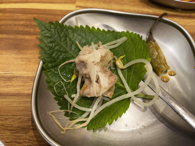 깻잎도 싸먹어보았습니다. 깻잎향이 소스와도 잘 어울리고 편백찜의 부드러움을 감싸는 식감도 좋고 다 좋았습니다. 깻잎과 같이 먹은게 가장 맛있게 먹은 것 같습니다.