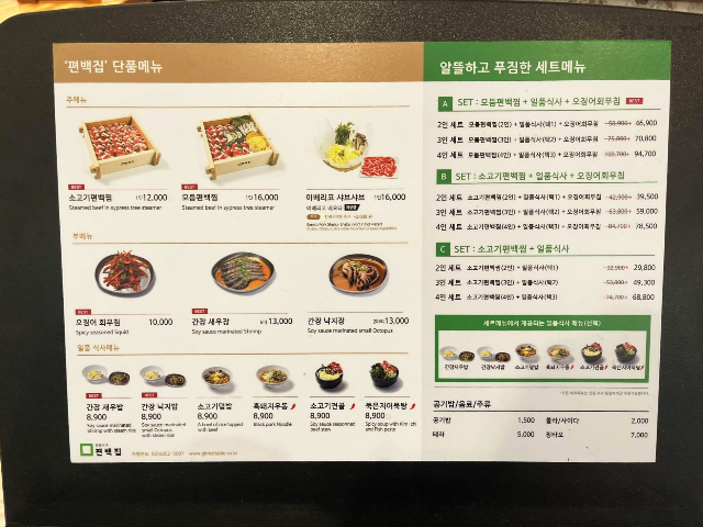 단품보다는 세트메뉴로 먹으려고 2인 세트를 보았습니다. A세트는 모듬편백찜+일품식사+오징어회무침 B세트는 소고기편백찜+일품식사+오징어회무침 C세트는 소고기편백찜+일품식사 입니다. 아내 분과 저는 오징어회무침은 먹고싶지 않아서 C세트 소고기편백찜+일품식사로 정하였습니다.