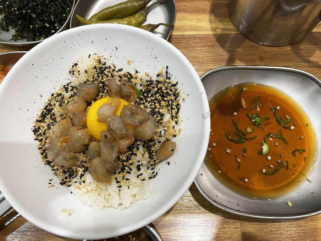 간장새우밥부터 먹어보았습니다. 짜지 않게 잘 익은 새우장과 계란밥이 너무나 잘 어울리고 맛있었습니다. 조금 느끼한 맛이 올라올 때쯤 빝반찬으로 같이 나왔던 김가루를 섞어 먹으니 고소함이 배가 되어 더 맛있게 먹을 수 있었습니다.