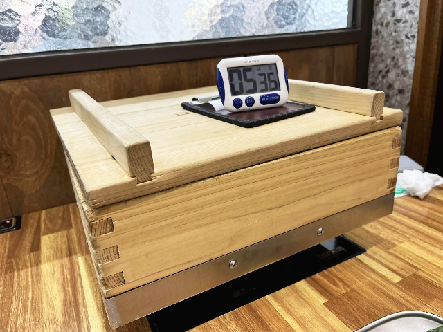 곧바로 편백나무의 찜기와 타이머가 같이 올라왔습니다. 시간이 지날수록 찜기에서 수증기가 올라오고 목욕 사우나에서 맡았던 편백나무 냄새가 퍼지기 시작했습니다.
