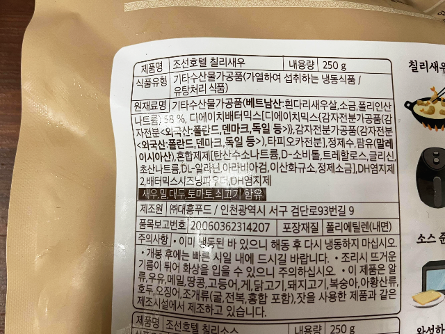 조선호텔 이름을 달고 나온 조선호텔 유니짜장, 조선호텔 삼선짬뽕 등이 있었지만 조선호텔 칠리새우만 구입하였습니다. 총 내용량은 500g인데 새우가 250g 칠리소스가 250g으로 같은 중량은 새우와 소스를 모두 중요하게 신경 썼다는 것 같습니다.