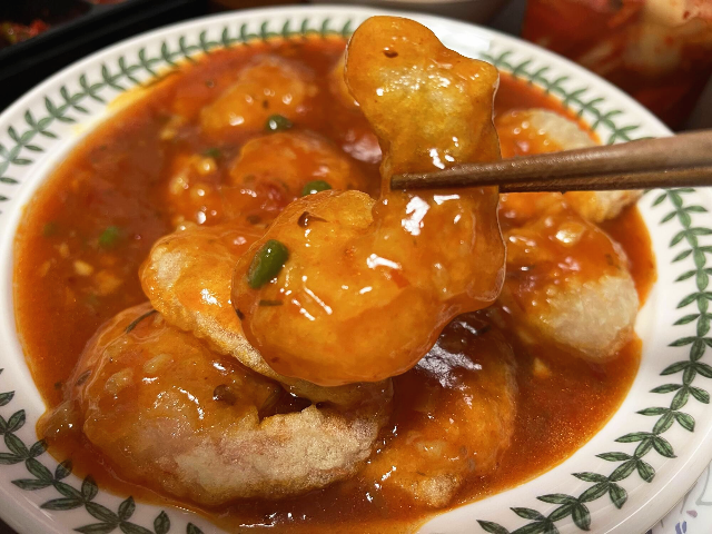 저는 소스를 듬뿍 발라서 먹어보았습니다. 소스가 양념치킨 맛도 조금 나면서 새콤한 맛이 강한게 특징인 것 같습니다. 먹다보니 소스가 정말 많이 남았는데요. 남은 소스는 꽃빵을 찍어 먹으면 맛있다고 합니다. 노브랜드 칠리새우보다 조금 비싸지만 중화풍 칠리새우를 좋아하시면 한번 먹어봐도 괜찮을 것 같네요.